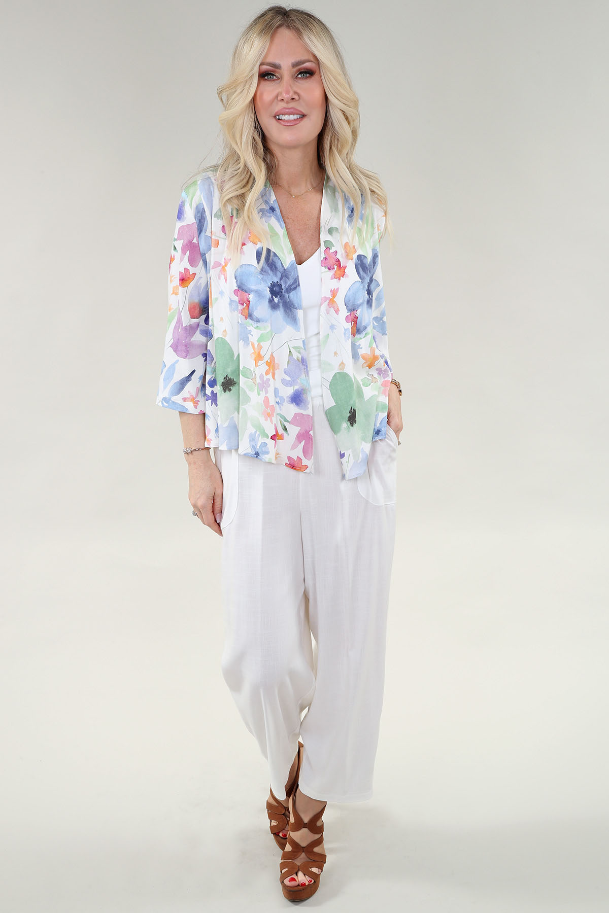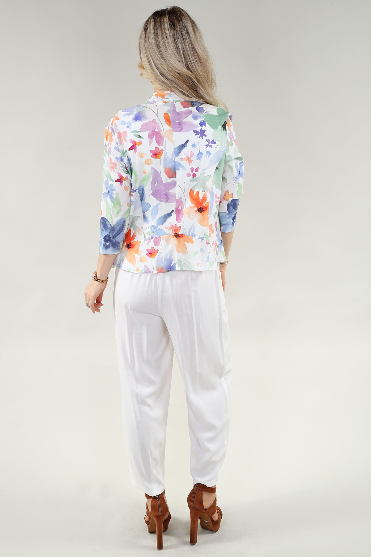Cardigan court à manches 3/4 en lin floral imprimé multicolore pastel