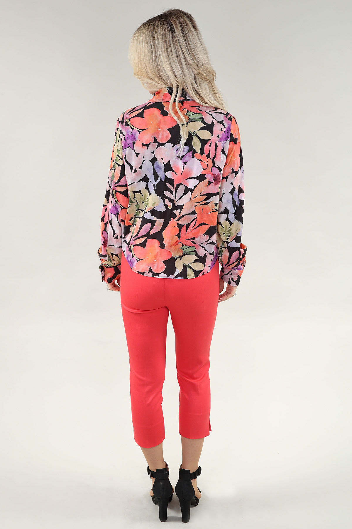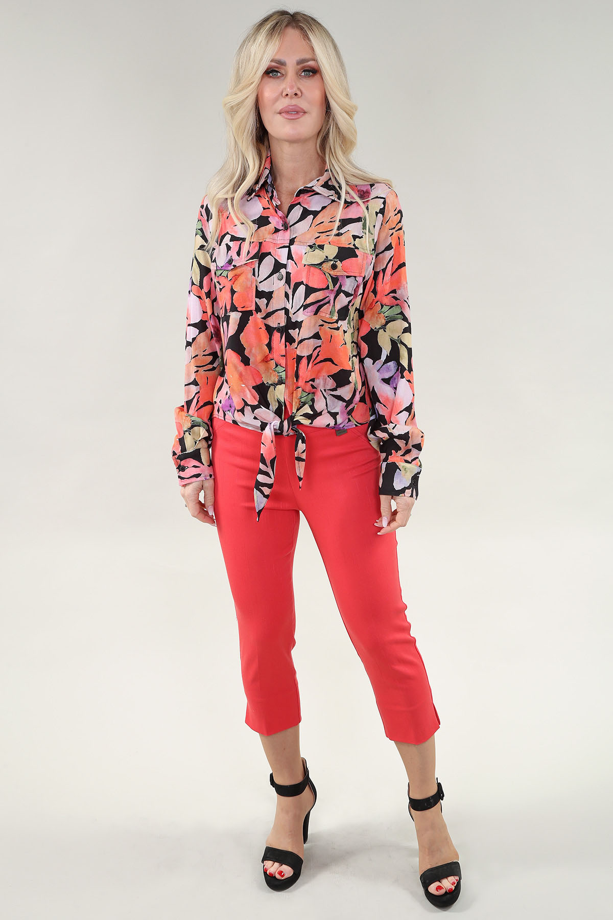 Chemise à manches longues – À nouer devant – Toile texturée noir et corail fleuri