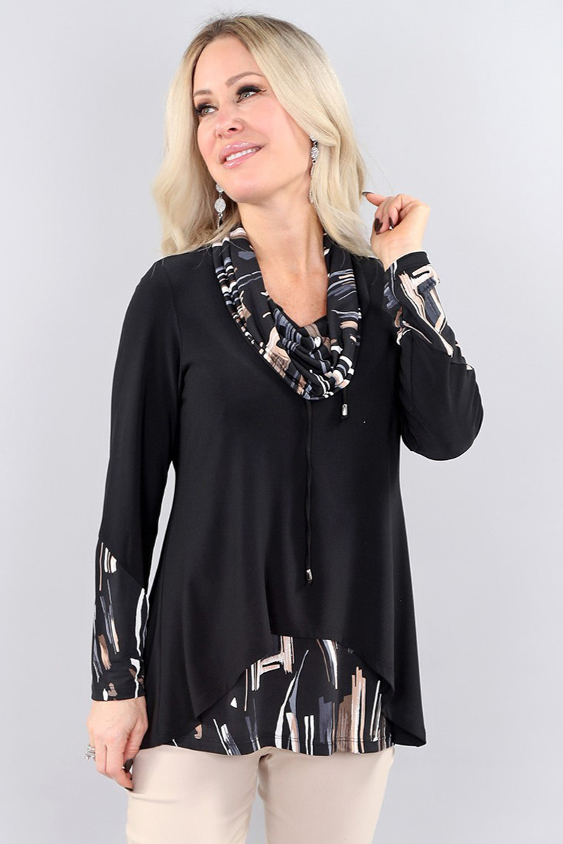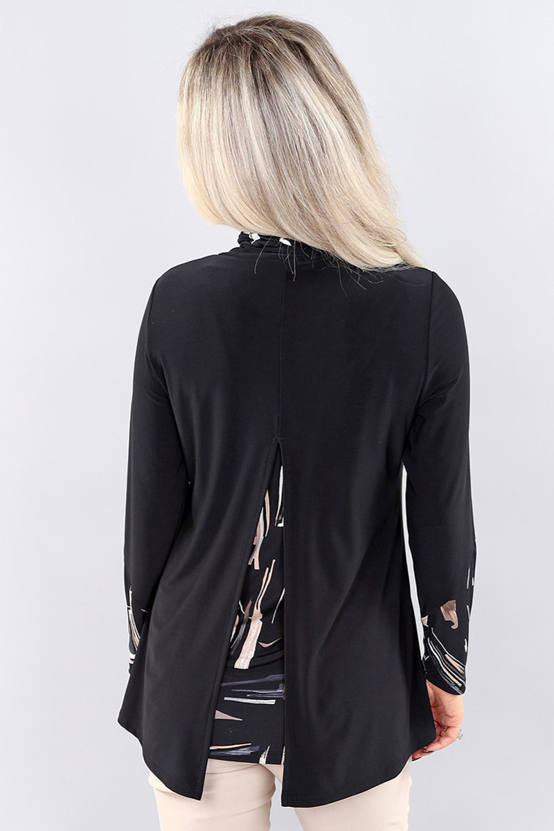 Ls Top – Split Back in Black-beige grey prt – Lightweight ls top – split back