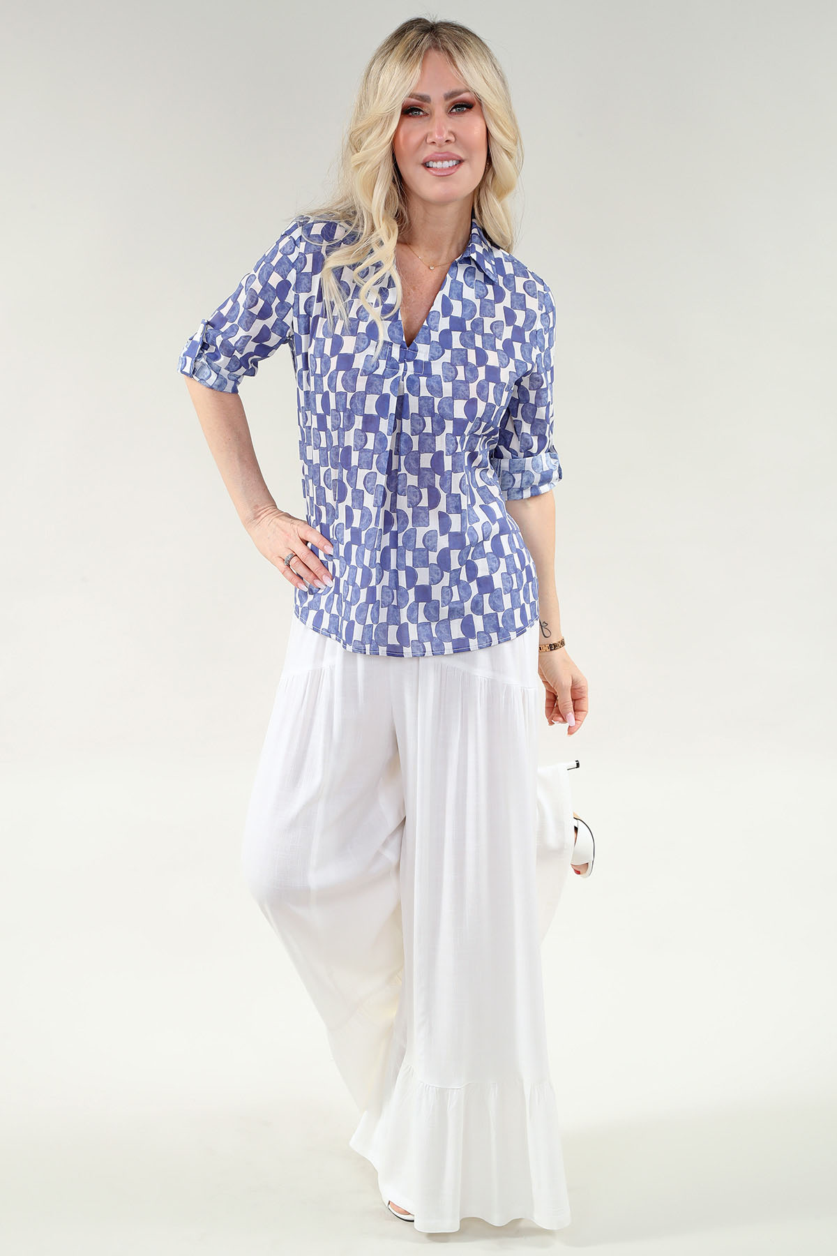 Le modèle 3/4 relevable Sleeve haut – Collar With col en V en A/S bleu ivoire square circle prt haut tissé chiffon apporte une pièce forte pour votre boutique. Tissu: tissé chiffon. Composition: 100 % viscose. Couleurs: A/S bleu ivoire square circle prt. Tailles: XS à XXXL. Catégorie: HAUT. Conçu pour un confort durable et une coupe fiable qui facilite la rotation en magasin.