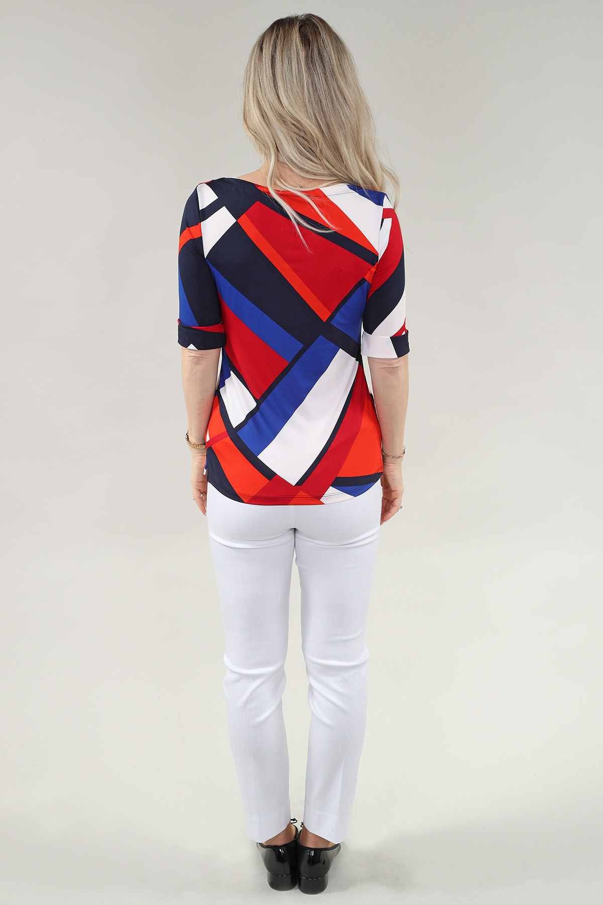 Affirmez votre style avec ce Haut à manches au coude avec revers. Conçu pour la femme moderne, ce haut allie esthétique chic et confort absolu. Confectionnée dans un mélange de 95% polyester 5% élasthanne de qualité supérieure, elle offre un toucher luxueux et un tombé impeccable. Idéale pour sublimer votre tenue de bureau ou ajouter une touche d’élégance à vos week-ends. Disponible en imprimé marine blanc.