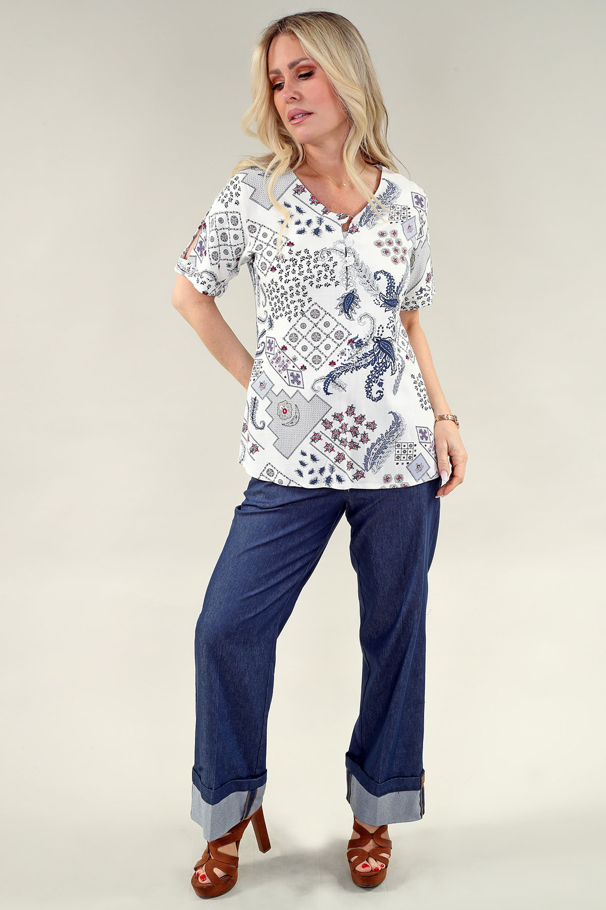 Affirmez votre style avec ce Haut à manches courtes fendues motif mixte. Conçu pour la femme moderne, ce haut allie esthétique chic et confort absolu. Confectionnée dans un mélange de 95% rayonne 5% élasthanne de qualité supérieure, elle offre un toucher luxueux et un tombé impeccable. Idéale pour sublimer votre tenue de bureau ou ajouter une touche d’élégance à vos week-ends. Disponible en motif mixte ivoire.