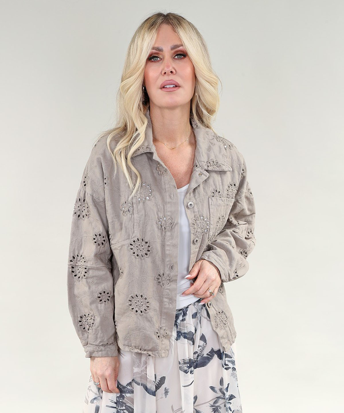 The Ls Jacket – Cutwork Floral Motifs in A/S Warm taupe offers a strong addition for your boutique collection. Crafted from Jeans, this jacket is designed for everyday comfort and ease of wear. Made with 95% Organic Cotton 5% Spandex, it provides reliable quality and easy care for your customers. A must have for retailers who want Michael Tyler pieces with multiple color options and a trusted jacket fit and consistent sell through.