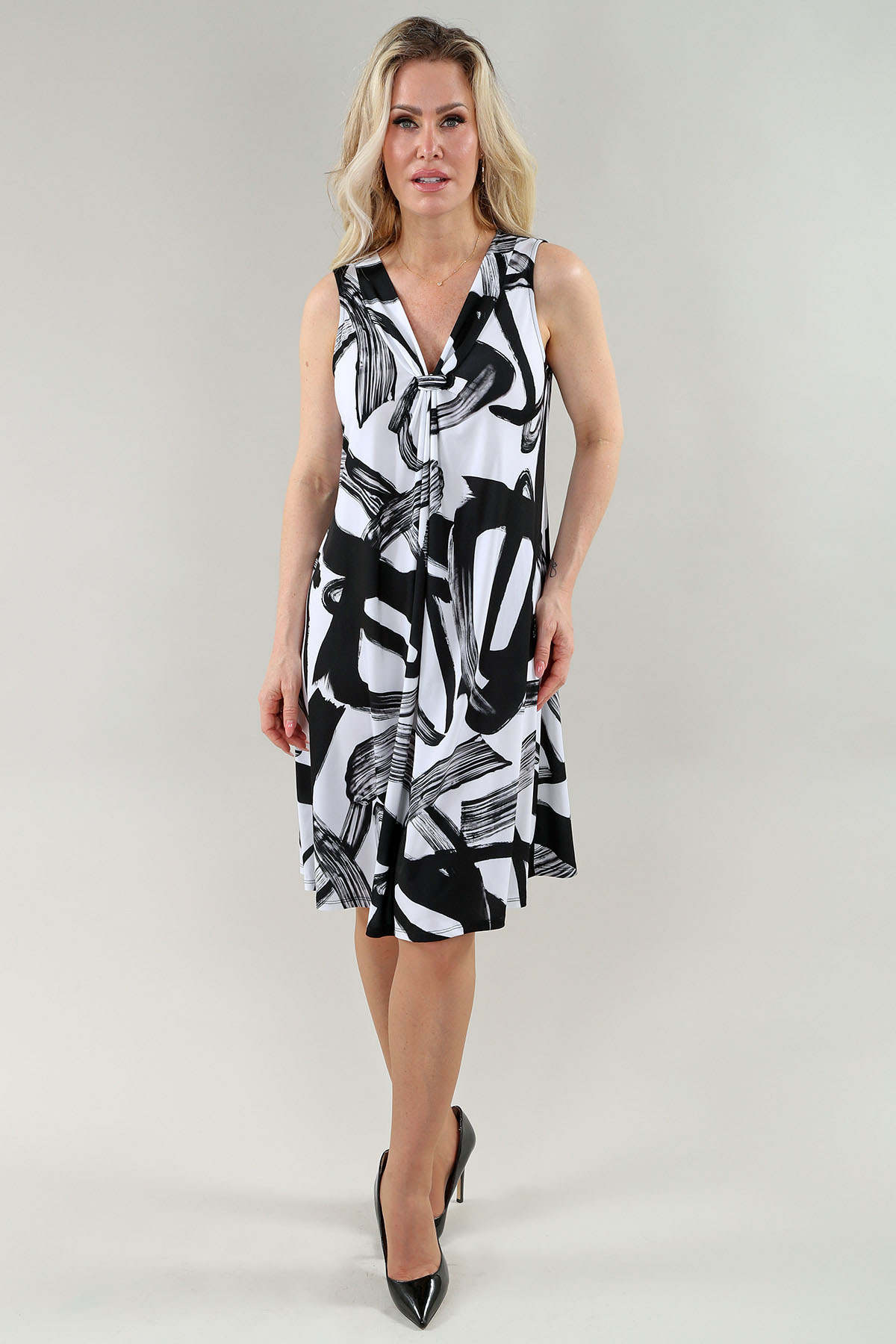 Affirmez votre style avec cette Robe sans manches nœud devant. Conçu pour la femme moderne, cette robe allie esthétique chic et confort absolu. Confectionnée dans un mélange de 95% polyster 5% élasthanne de qualité supérieure, elle offre un toucher luxueux et un tombé impeccable. Idéale pour sublimer votre tenue de bureau ou ajouter une touche d’élégance à vos week-ends. Disponible en imprimé multicolore noir et blanc.