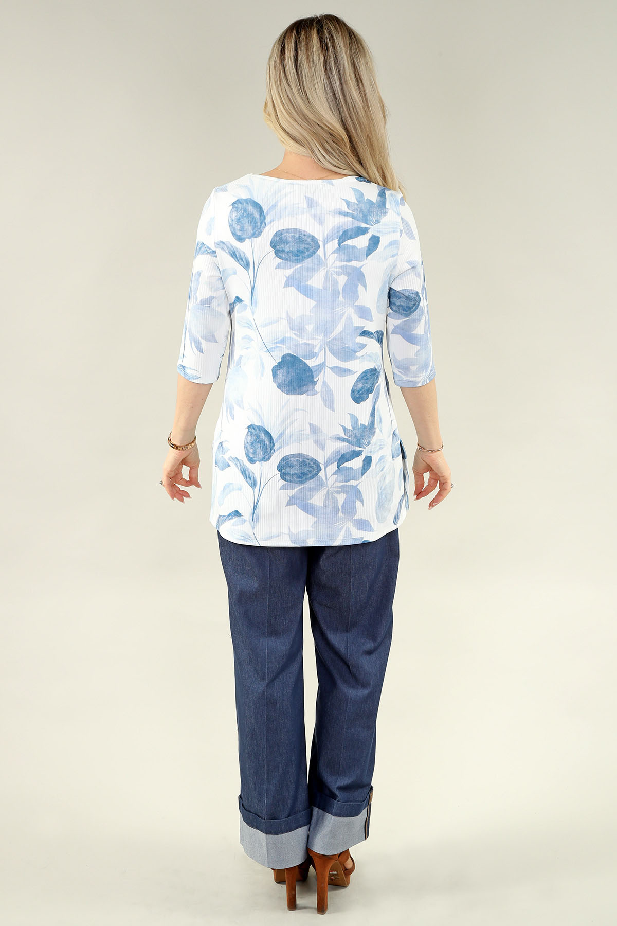 3/4 Sleeve Top-Side Slit- Floral in A/S Light blue floral Top Printed Knit