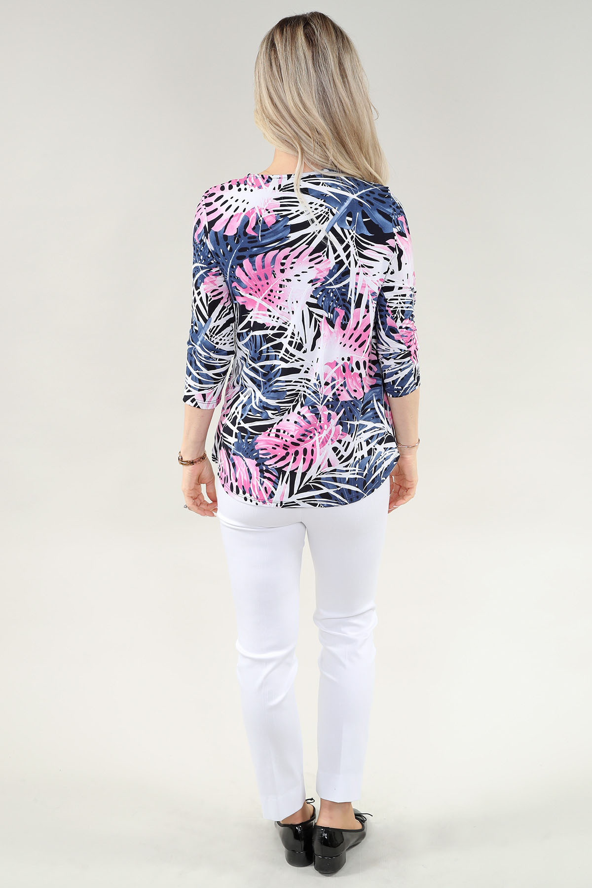 3/4 Sleeve Top-Side Slit in A/S Navy pink Foliage print Top Printed Ity