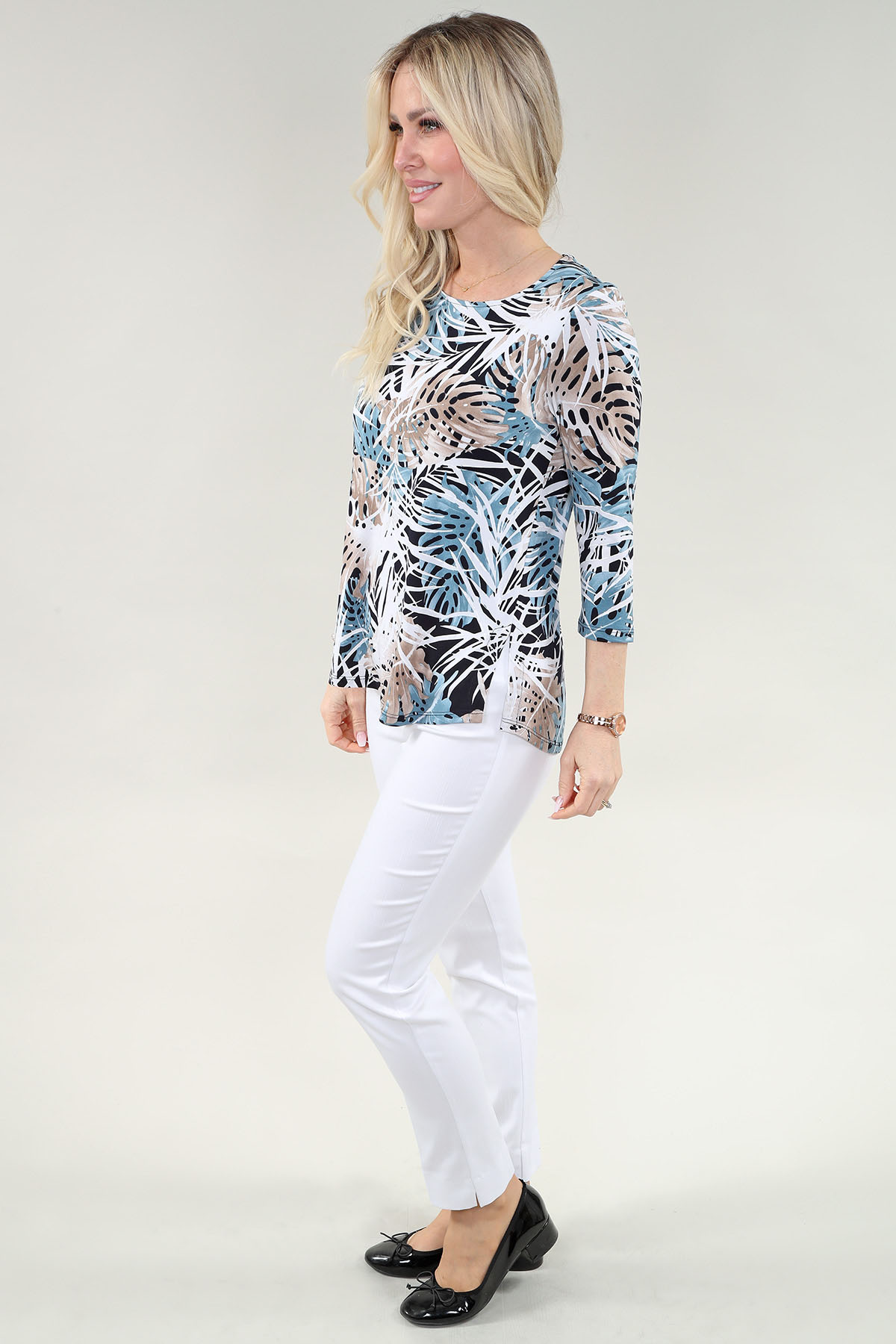 3/4 Sleeve Top-Side Slit in A/S Navy sand Foliage print Top Printed Ity