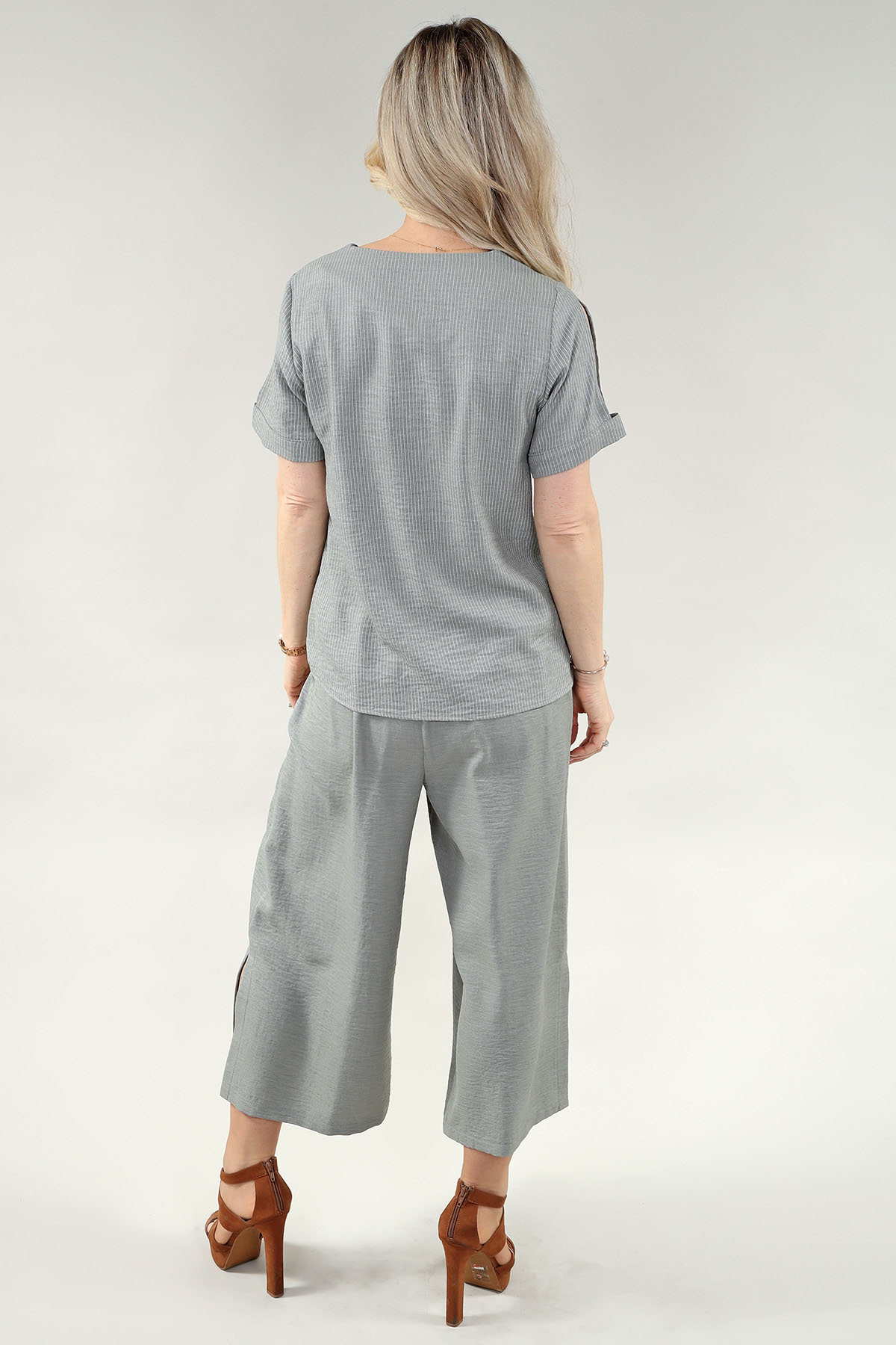 Open Short Sleeve Top- V Neck With Buttons in A/S Khaki stripes Top Cotton Blend